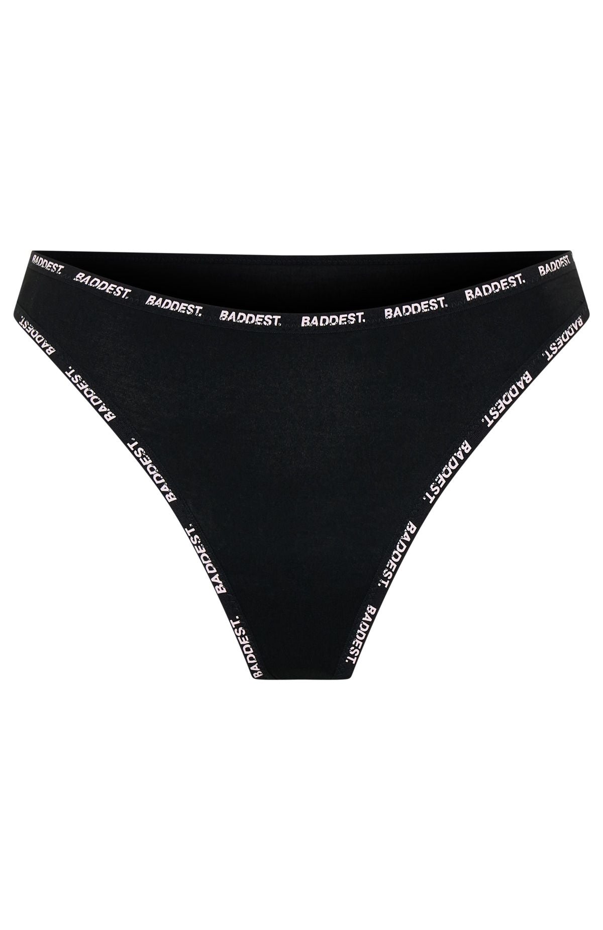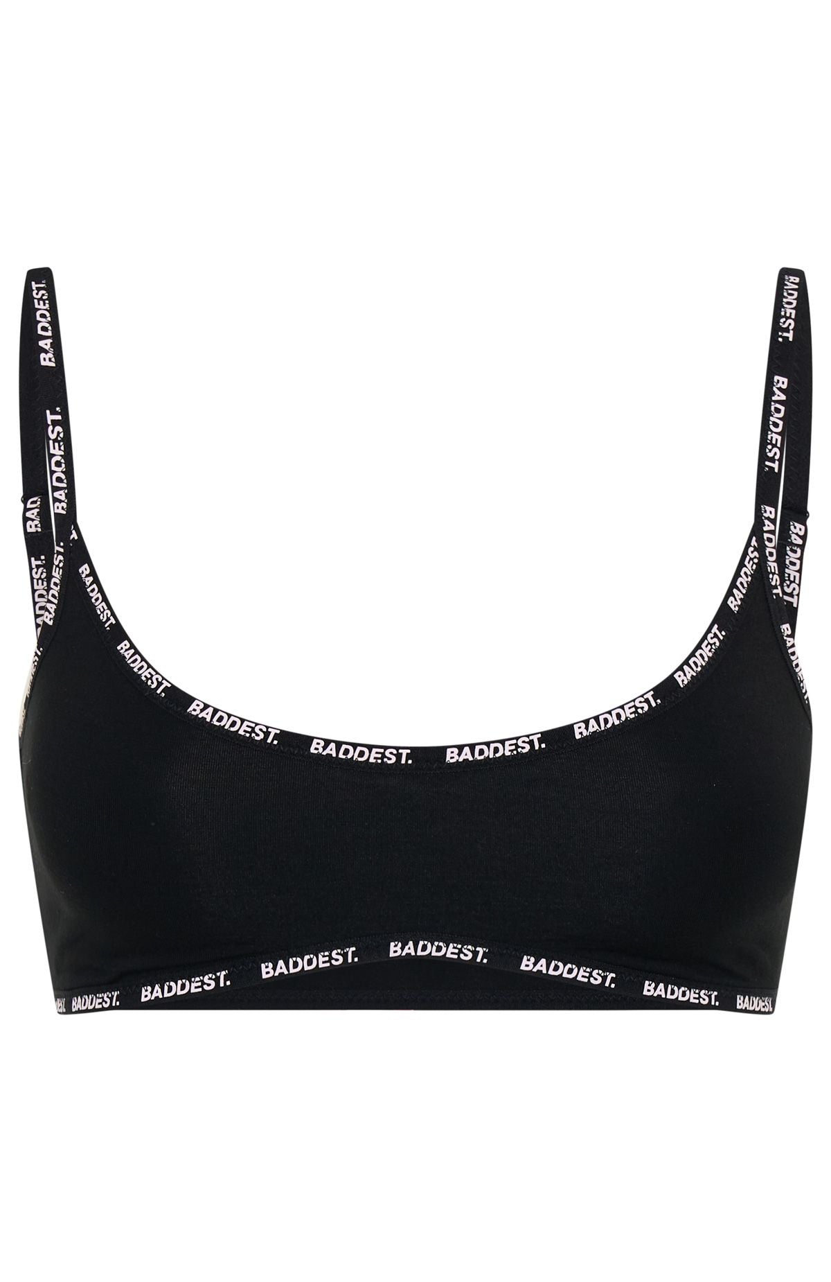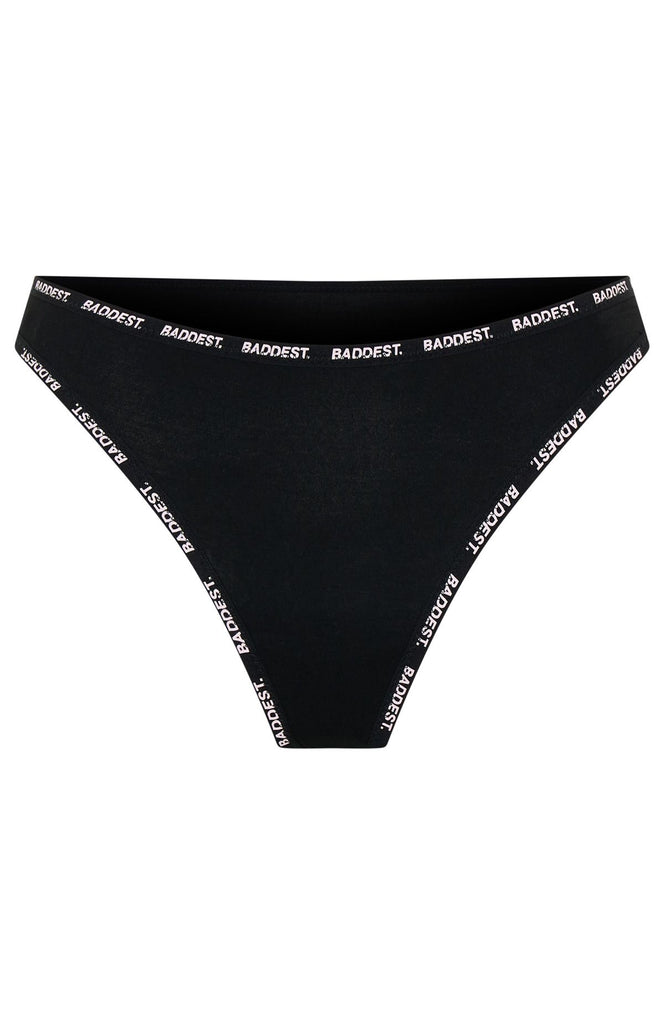 The Baddest Cozy Lingerie Set in Black features a statement Baddest binding, thin adjustable straps, scoop neckline, high stretch fabrication, lined, and a matching thong.